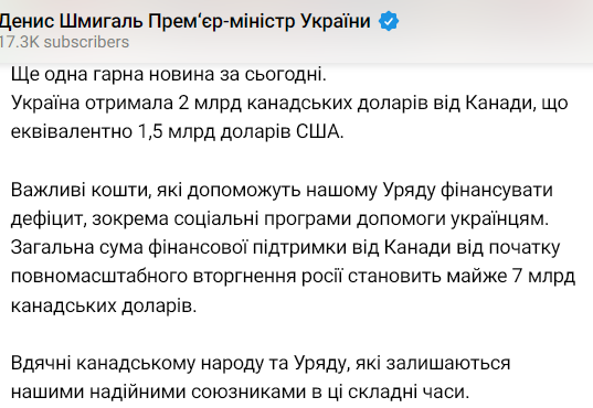 Шмыгаль добавил, что с начала войны Канада предоставила Украине помощь на сумму в размере почти семи миллиардов канадских долларов.