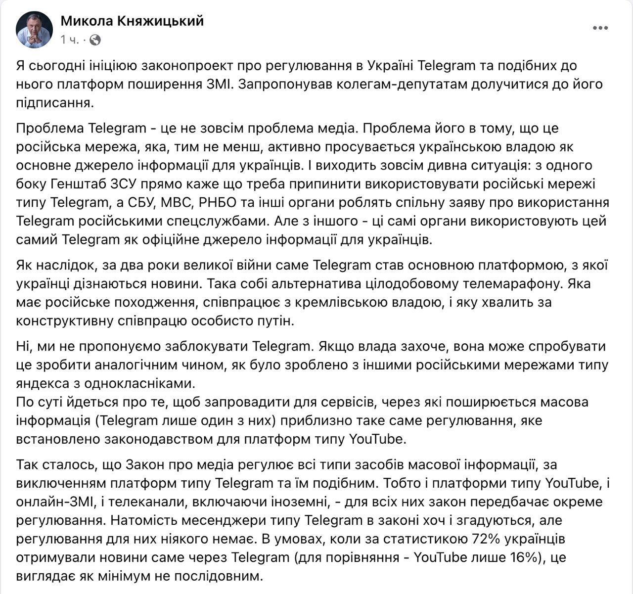 Нардеп "Европейской солидарности" Николай Княжицкий внесет в Верховную Раду законопроект о госрегулировании Телеграма.