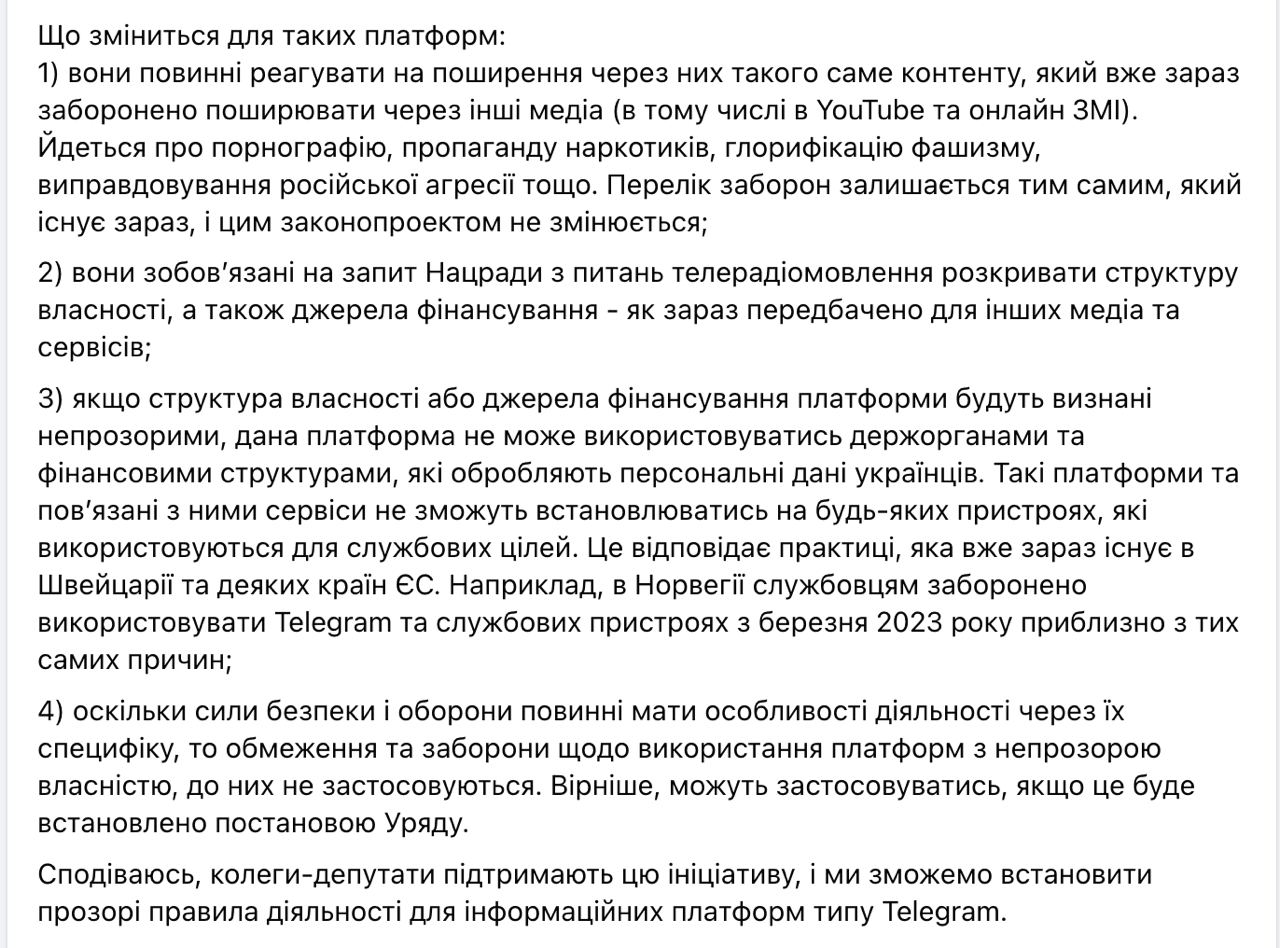 - если эту структуру и источники признают непрозрачными, то платформа не может использоваться госорганами и финансовыми структурами, которые обрабатывают персональные данные украинцев (что под этим подразумевается, непонятно - весь Телеграм или отдельные "непрозрачные" каналы).