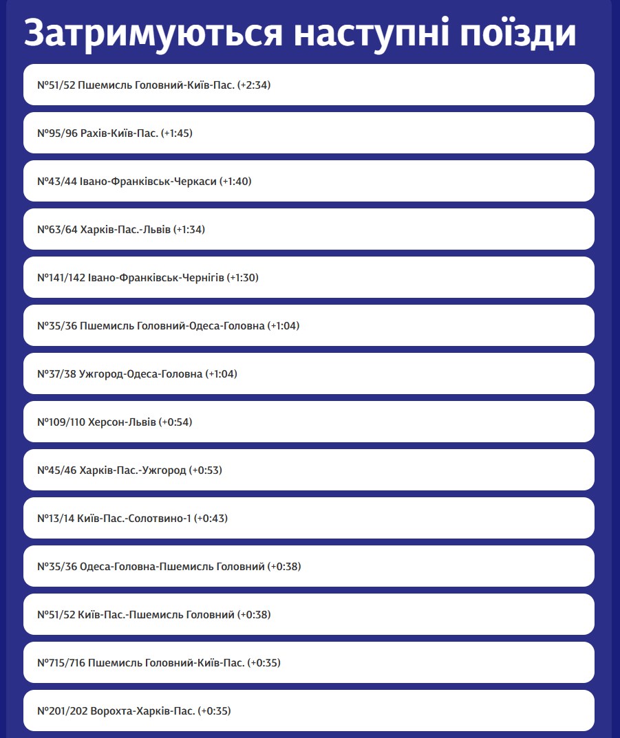 "Укрзализныця" публикует график поездов, которые опаздывают на данный момент.