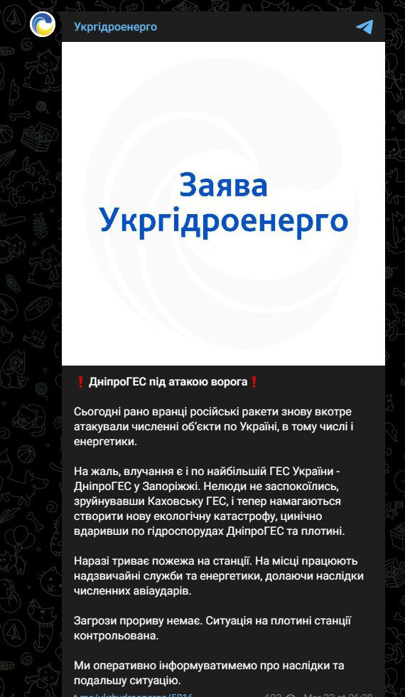 "Враг имел целью полностью вывести из строя объект, там сейчас продолжаются работы по оценке повреждений. Позже, в течение дня, можно сказать статус по этому объекту. Хочу отметить, что пока нет никакой информации или рисков прорыва дамбы. Повреждения большие, но они касаются работы именно электростанций на генерацию электроэнергии", - говорит Кудрицкий.