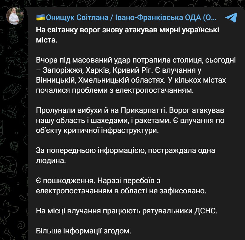 "Раздались взрывы и в Прикарпатье. Враг атаковал нашу область и шахедами, и ракетами. Есть попадание по объекту критической инфраструктуры.