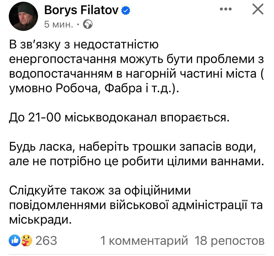 "Самая тяжелая ситуация в городе Харьков, там враг буквально пытался уничтожить все основные энергетические объекты, которые питают город. И, если в Харьковской области ситуация с энергоснабжением стабильная, то в самом Харькове ситуация чрезвычайно сложная", - рассказал  Кудрицкий.