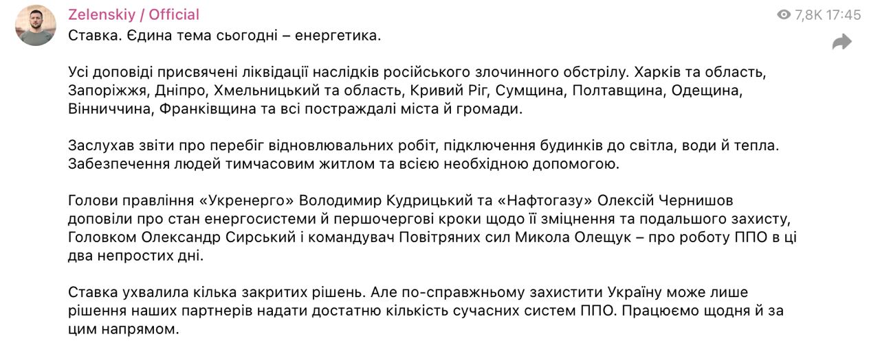 "Ставка приняла несколько закрытых решений. Но по-настоящему защитить Украину может только решение наших партнеров предоставить достаточное количество современных систем ПВО. Работаем ежедневно и по этому направлению", - пишет президент.