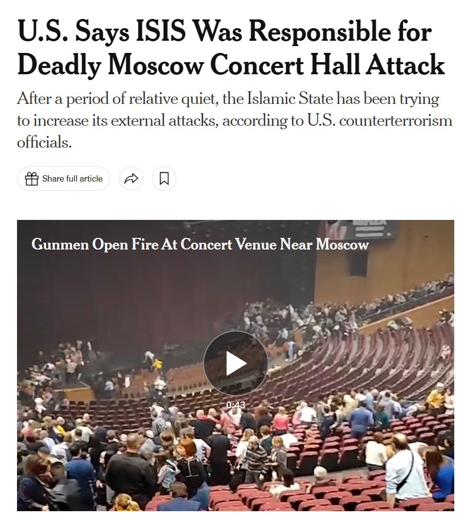 Со вчерашнего дня основная версия западных СМИ по поводу теракта в подмосковном "Крокусе" - это дело рук ИГИЛ.