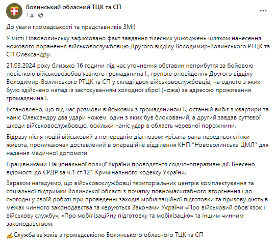 Мужчина напал с ножом на военкомов, которые пришли к нему домой. Они пришли узнать, почему мужчина не явился по повестке в военкомат. Инцидент случился 21 марта в городе Нововолынском на Волыни.