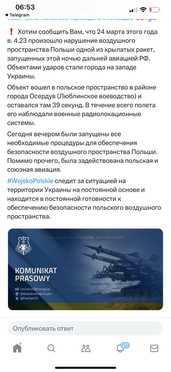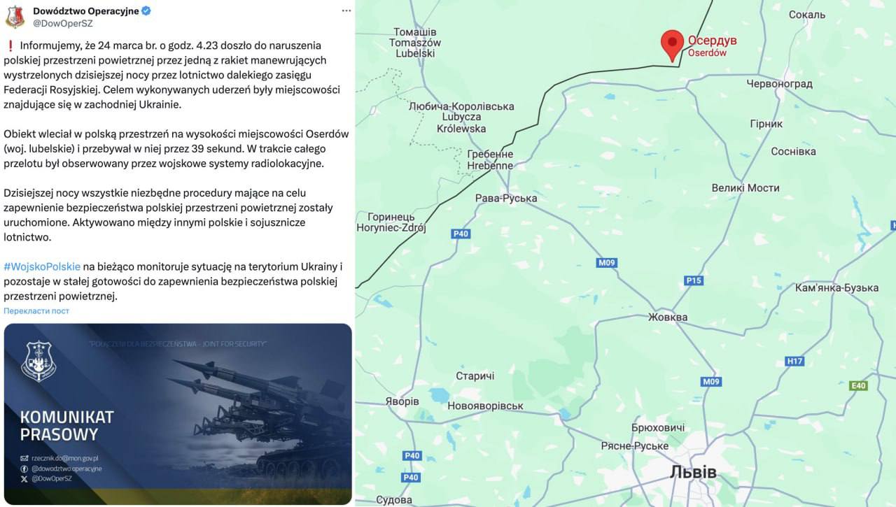 07:58 Одна из российских ракет во время сегодняшней ночной атаки на западную Украину зашла на 39 секунд в воздушное пространство Польши около города Осердув.