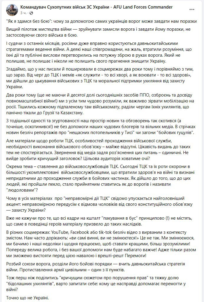 15:45 Командующий Сухопутными войсками Павлюк призвал не публиковать видео с жесткими задержаниями уклонистов - потому что это мешает Украине победить в войне.