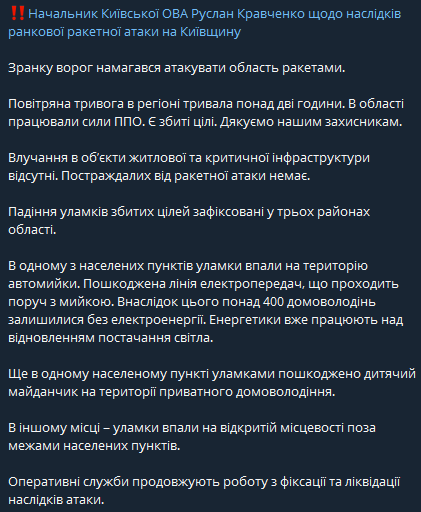 Сегодня утром российские войска нанесли удар по Киевской области. Падение обломков сбитых целей зафиксировано в трех районах области.