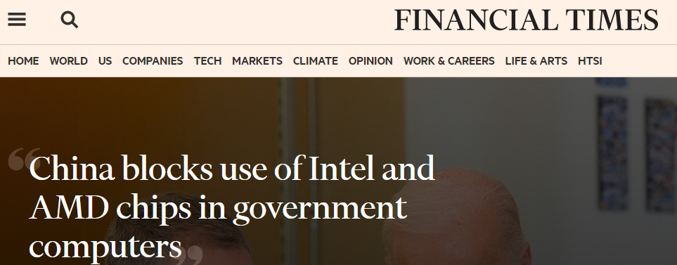 В Китае госструктуры обяжут не использовать компьютерную технику с чипами американских компаний - FT