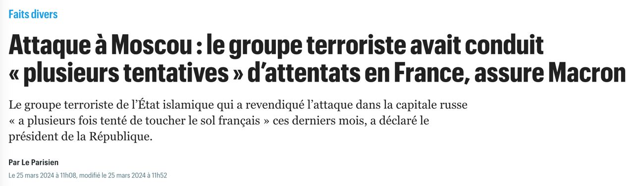 Кроме того, он заявил, что группировка ИГИЛ "Вилаят Хорасан", взявшая на себя ответственность за нападение в РФ, за последние месяцы предпринимала несколько попыток покушений на территории Франции, Германии и других европейских стран. Особенно активно она действовала в конце 2022 года.