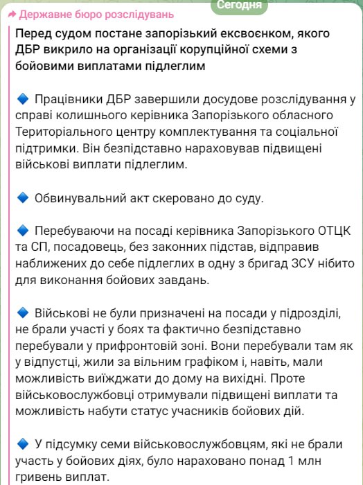 По данным ГБР, будучи руководителем Запорожского ОТЦК, военком отправил приближенных к себе подчиненных в одну из бригад ВСУ якобы для выполнения боевых задач.