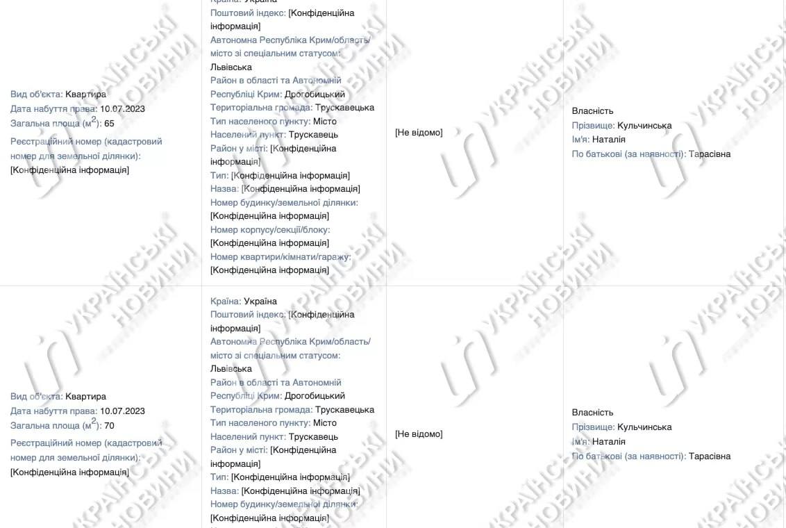 По информации агентства, 10 июля 2023 года Кульчинская получила в собственность две квартиры в Трускавце площадью по 65 квадратных метров. В тот же день она получила в собственность квартиру площадью 70 квадратов.