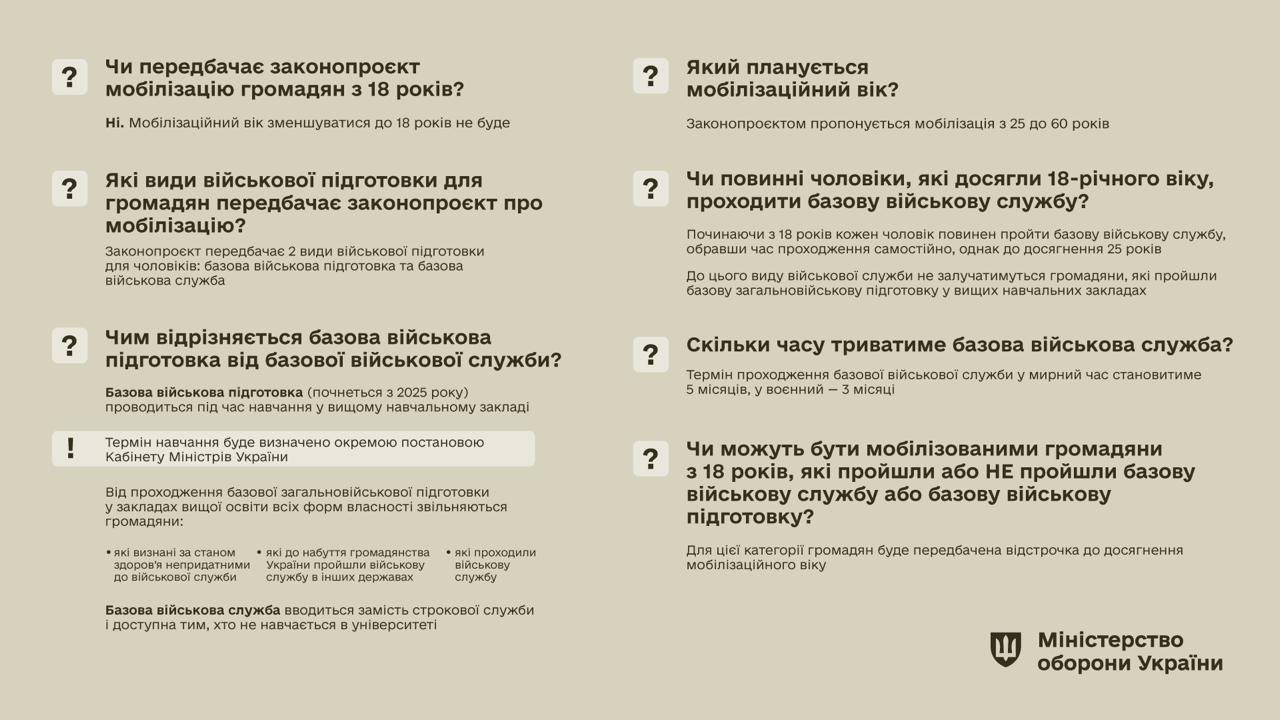 "Граждане с 18 лет, независимо от прохождения базовой военной подготовки или службы, получат отсрочку до достижения мобилизационного возраста", - заявило ведомство, уточнив, что такой возраст планируют понизить до 25 лет.