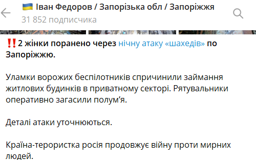"Две женщины ранены из-за ночной атаки "Шахедов" по Запорожью. Обломки вражеских беспилотников привели к возгоранию жилых домов в частном секторе. Спасатели оперативно потушили пламя. Детали атаки уточняются", - говорится в сообщении.