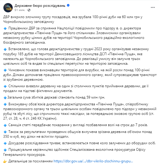Руководство государственного предприятия "Северная Пуща", вместе с соучастниками, организовало незаконную вырубку дубов на территории Чернобыльского радиационно-экологического биосферного заповедника.