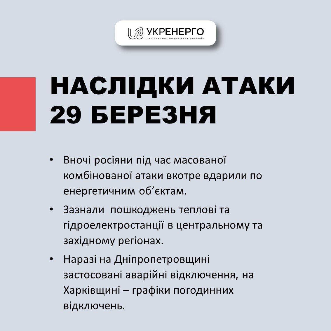 Ночью 29 марта россияне провели очередную массированную атаку по объектам энергетики Украины.