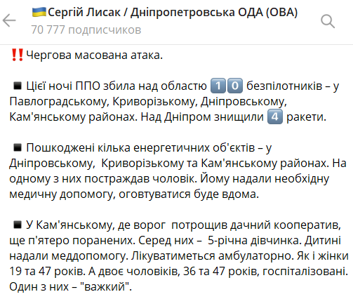В свою очередь глава Днепропетровской областной военной администрации Сергей Лысак сообщил, что в ходе ночной воздушной атаки повреждены несколько энергетических объектов Днепропетровской области.