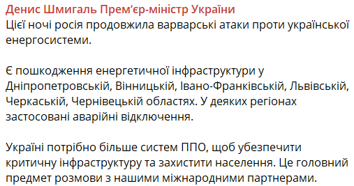 Премьер-министр Украины Денис Шмыгаль сообщил, в каких областях этой ночью были прилеты по объектам энергосистемы: Днепропетровской, Винницкой, Ивано-Франковской, Львовской, Черкасской и Черновицкой.