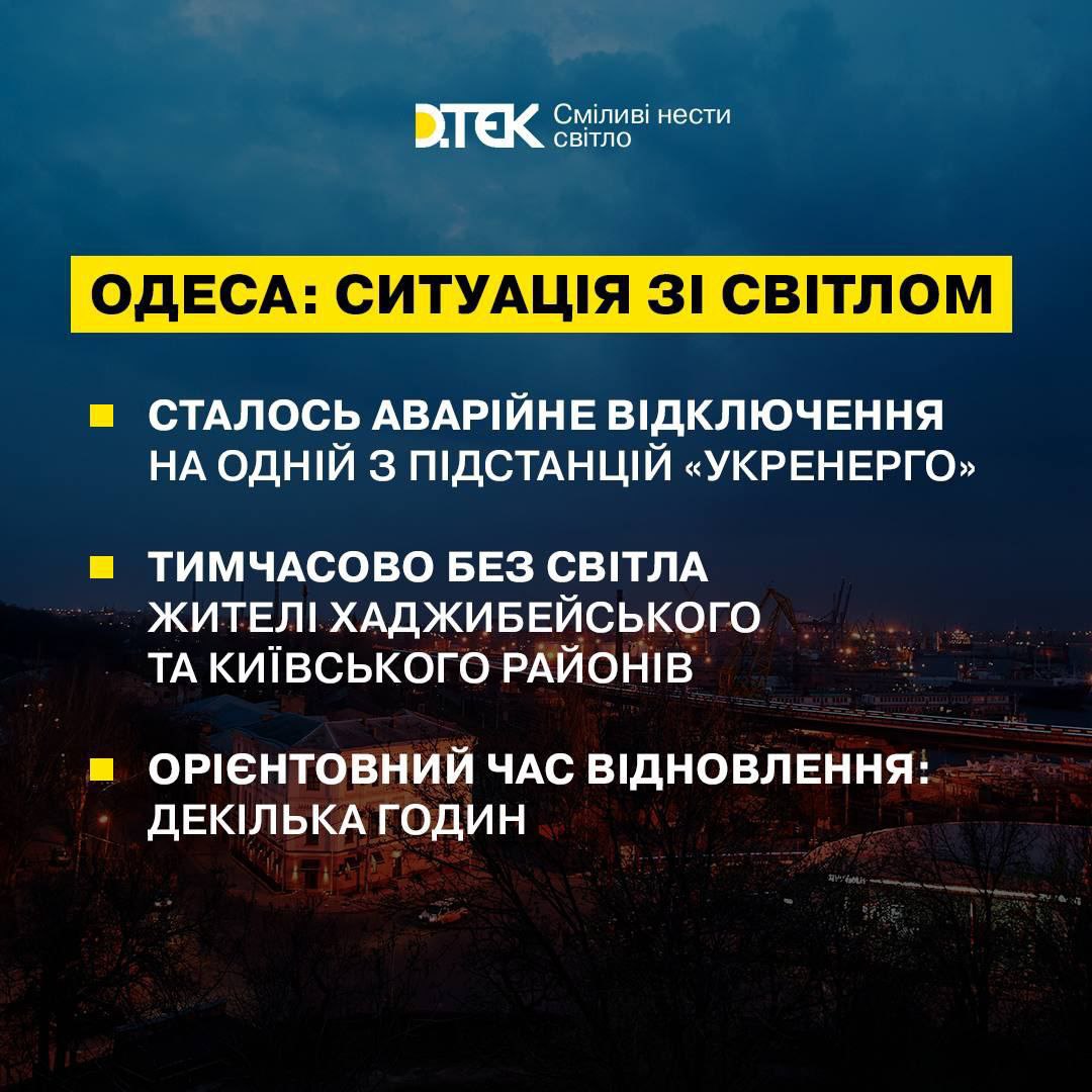 В то же время в Одессе аварийно отключилась подстанция, из-за чего без света остались жители Хаджибейского и Киевского районов, сообщает ДТЭК.