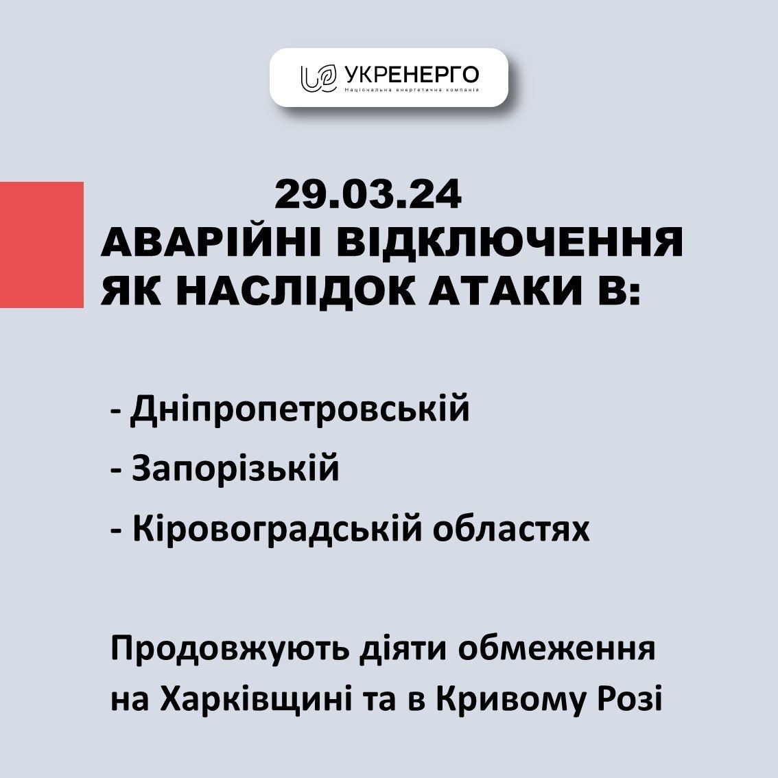 Также ограничения подачи света продолжают действовать в Харьковской области и Кривом Роге. Причина - недостаток генерации после ночного обстрела.
