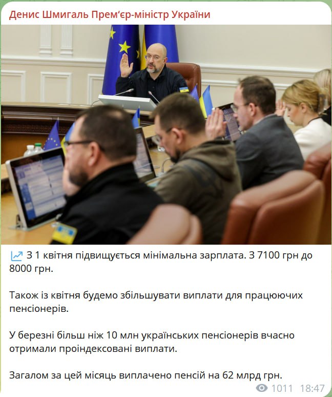 А перед этим Кабинет министров утвердил индексацию пенсий с 1 марта. Повышаются пенсии для 9,5 млн пенсионеров, почти 600 тысяч пенсионеров силовых ведомств, почти 100 тысяч участникам ликвидации аварии на Чернобыльской АЭС. Кроме того, с 1 апреля пройдет автоматический перерасчет пенсий для 654 тысяч работающих пенсионеров с учетом обновленного страхового стажа.