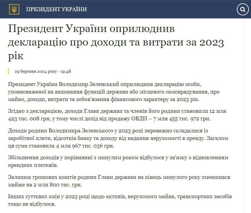 Доходы семьи Зеленского в 2023 году, согласно сообщению Офиса президента, в основном состояли из заработной платы, процентов банка и дохода от предоставления недвижимости в аренду. В общей сложности эта сумма составила 4 млн 967 тысяч 036 грн.