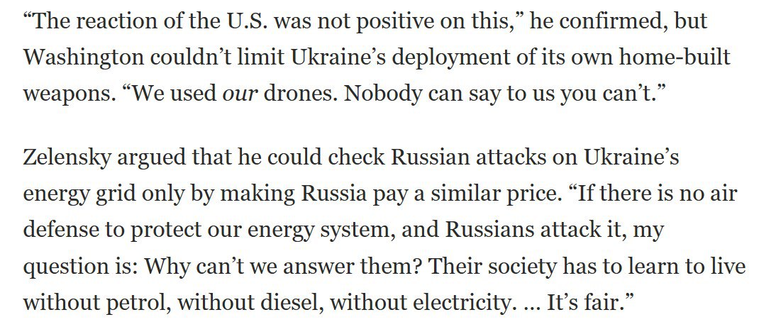 "Если нет противовоздушной обороны для защиты нашей энергетической системы, и россияне атакуют ее, мой вопрос: почему мы не можем им ответить? Их общество должно научиться жить без бензина, без дизеля, без электричества. Это честно. Когда Россия прекратит эти шаги, мы остановимся", - сказал он.