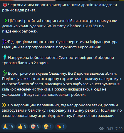 Сегодня ночью российские войска атаковали Одесскую область с помощью "Шахедов". Обломки сбитых БПЛА упали на объект энергоинфраструктуры.