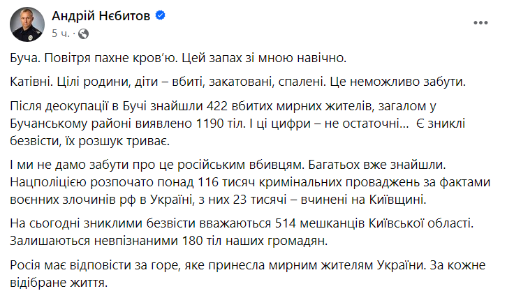 "После деоккупации в Буче были обнаружены тела 422 убитых мирных жителей, а в Бучанском районе – 1 190 тел. Нацполицией начато более 116 тысяч уголовных производств по фактам военных преступлений России в Украине, из них 23 тысячи совершены в Киевской области. На сегодняшний день пропавшими без вести считаются 514 жителей Киевской области. Остаются неопознанными 180 тел наших граждан", - говорится в сообщении замглавы Нацполиции.