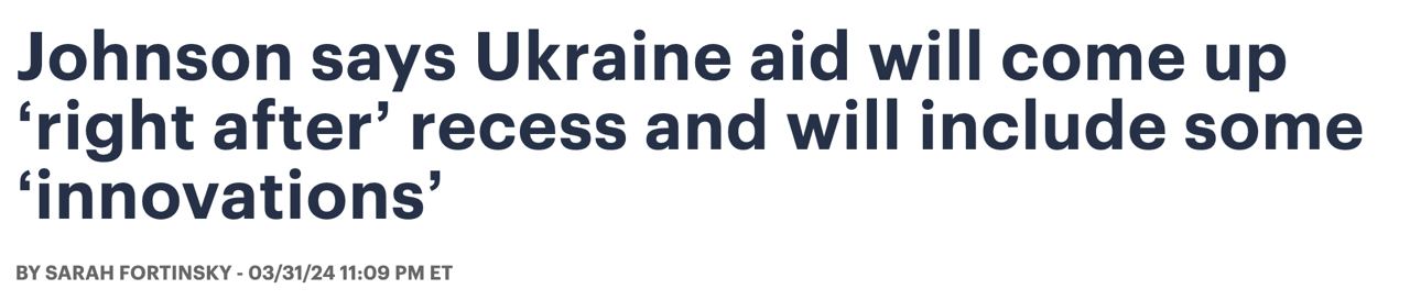Спикер Палаты представителей Майк Джонсон заявил, что вынесет на голосование свой законопроект о помощи Украине "сразу после" каникул, которые заканчиваются 9 апреля.