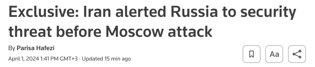 "За несколько дней до нападения в России Тегеран поделился с Москвой информацией о возможном крупном теракте внутри России, полученной в ходе допросов арестованных в связи со смертоносными взрывами в Иране", - сказал источник.