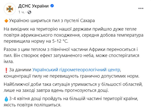Затем по Украине пройдет дождь, который прибьет пыль к земле. Завтра он ожидается на Западной Украине, а 3-4 апреля - на остальной территории.