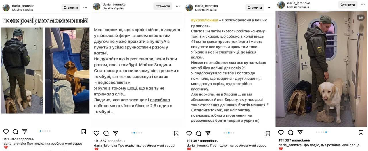 "Мне стыдно, что в стране война, а человек в военной форме со своим хвостатым другом не может проехать из пункта А в пункт Б со всеми удобствами вместе в вагоне. Не думайте, что их разъединили, они ехали вместе, но в тамбуре. Почти 3 часа. Спросив у парня, почему он с вещами в тамбуре, он тяжело вздохнул и сказал: "Не разрешили". Я ехала в новой электричке, где места полно. Неужели не нашлось какого-то уголка-места хотя бы возле полки для чемоданов?!" - пишет очевидица.