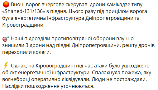 "В этот раз под прицелом врага находилась энергетическая инфраструктура Днепропетровщины и Кировоградщины. Наши подразделения противовоздушной обороны уничтожили три дрона над юге Днепропетровщины, остальные дроны перехватили коллеги. Однако в Кировоградской области во время атаки был поврежден объект энергетической инфраструктуры. Вспыхнул пожар, который пожарные оперативно ликвидировали. Люди не пострадали. Последствия повреждений уточняются", - сообщили Силы обороны юга Украины.