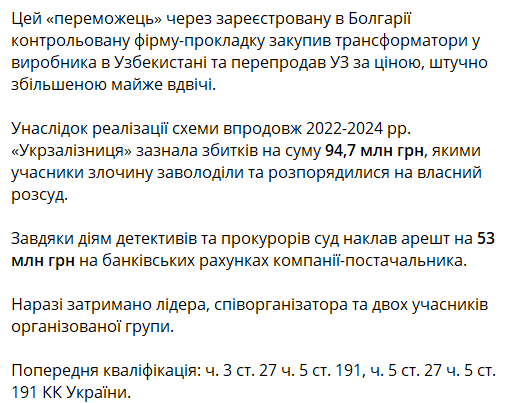 При этом компанию-победителя контролирует гражданин Беларуси, который, по данным НАБУ, имеет связи с РФ. Он закупил трансформаторы в Узбекистане и перепродал УЗ по завышенным почти вдвое ценам.