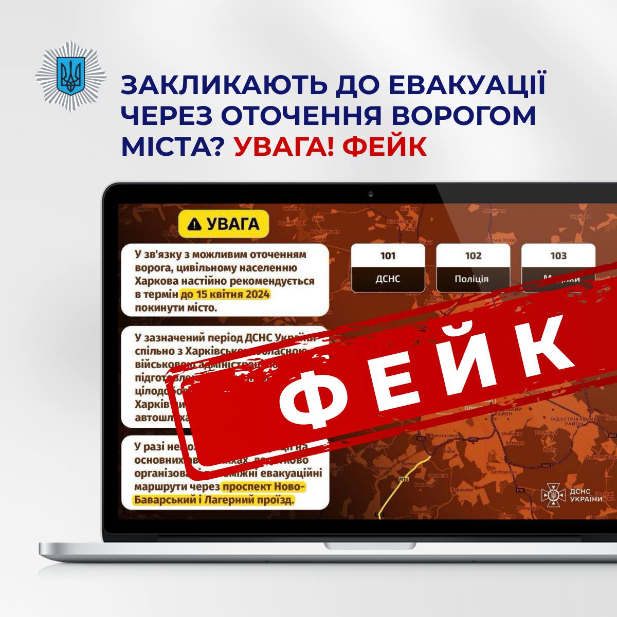 Информация об эвакуации из Харькова и его окрестностей из-за вероятного окружения города российскими войсками, распространяемая якобы от Государственной службы по чрезвычайным ситуациям – это фейк.