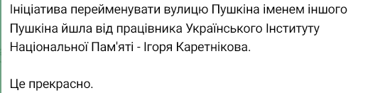 Паблик уточняет, что инициатива переименовать улицу Пушкина именем другого Пушкина исходила от работника Украинского Института Национальной Памяти – Игоря Каретникова.