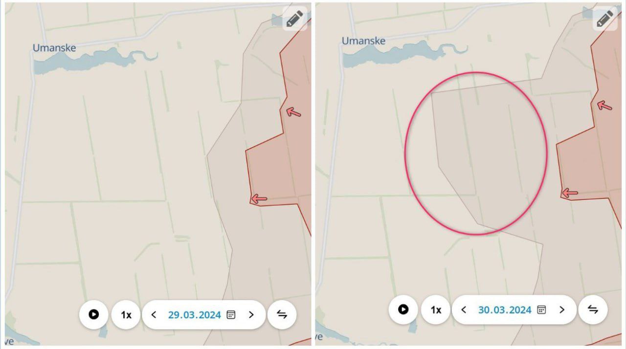 Но на прошлой неделе два последних населённых пункта, судя по данным украинских военных телеграм-каналов, пали. РФ официально об этом заявила, Украина их захват не подтверждала. И от тех рубежей сейчас россияне пытаются развивать  дальнейшее наступление к западу: на посёлки Семёновку и Уманское.