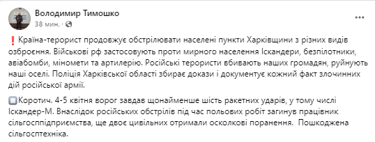 "В результате российских обстрелов во время полевых работ погиб работник сельхозпредприятия, еще двое гражданских получили осколочные ранения. Повреждена сельхозтехника", – сообщил он.