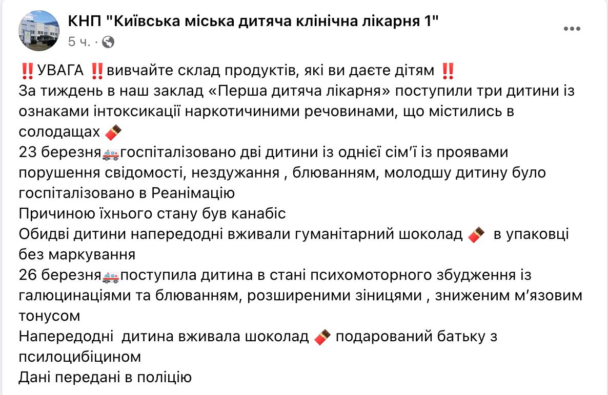 В Киеве за неделю госпитализировали трех детей, которые наелись шоколада с грибами и марихуаной.