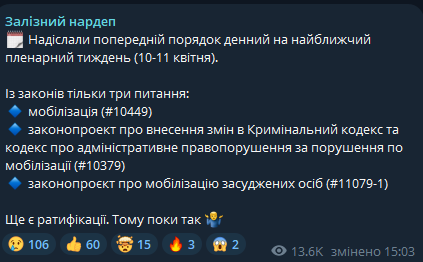 Верховная Рада должна рассмотреть законопроект об ужесточении мобилизации во втором чтении на следующей неделе. Вопрос уже внесен в предварительную повестку дня на пленарную неделю 10-11 апреля.