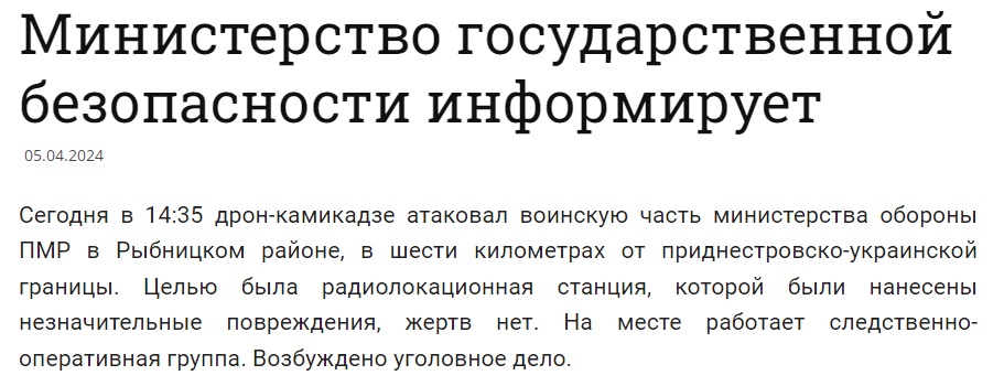 "Сегодня в 14:35 дрон-камикадзе атаковал воинскую часть министерства обороны ПМР в Рыбницком районе, в шести километрах от приднестровско-украинской границы. Целью была радиолокационная станция, которой были нанесены незначительные повреждения, жертв нет. На месте работает следственно-оперативная группа. Возбуждено уголовное дело", - сказано в сообщении.