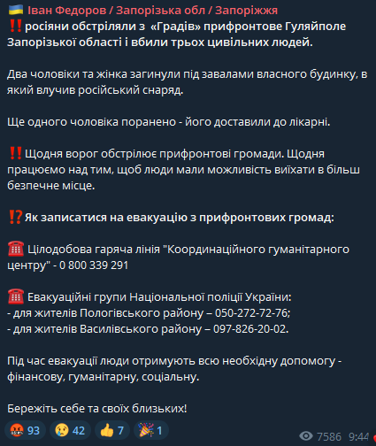 "Россияне обстреляли из "Градов" прифронтовое Гуляйполе Запорожской области и убили трех гражданских людей. Двое мужчин и женщина погибли под завалами собственного дома, в который попал российский снаряд", - говорится в сообщении.