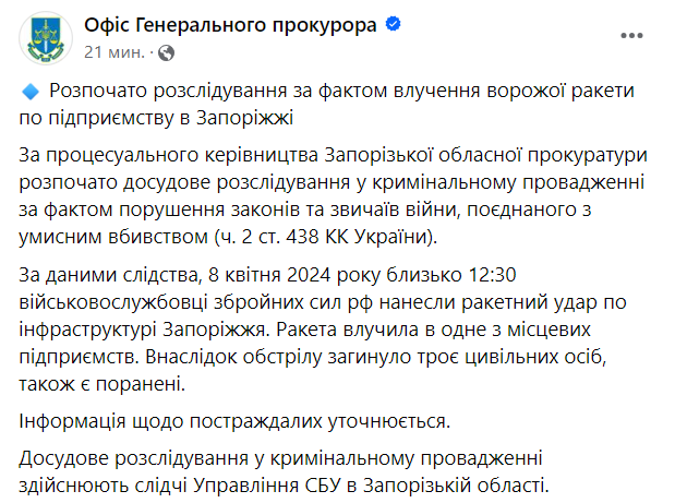 По данным следствия, 8 апреля 2024 года около 12:30 военнослужащие вооруженных сил России нанесли ракетный удар по инфраструктуре Запорожья. Ракета попала в одно из местных предприятий. В результате обстрела погибли трое гражданских лиц, также есть раненые.