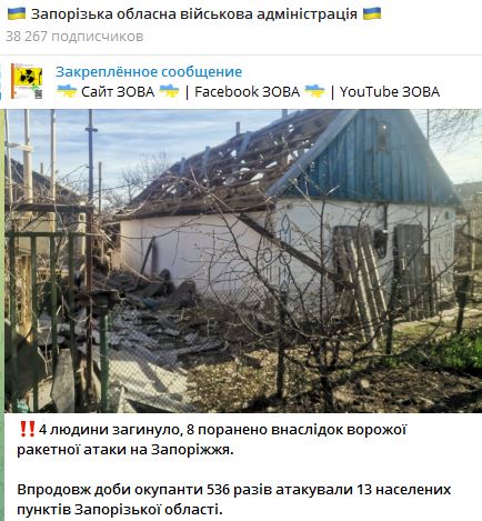 По состоянию на утро 9 апреля известно, что четыре человека погибли, восемь ранены в результате вражеской ракетной атаки на Запорожье.