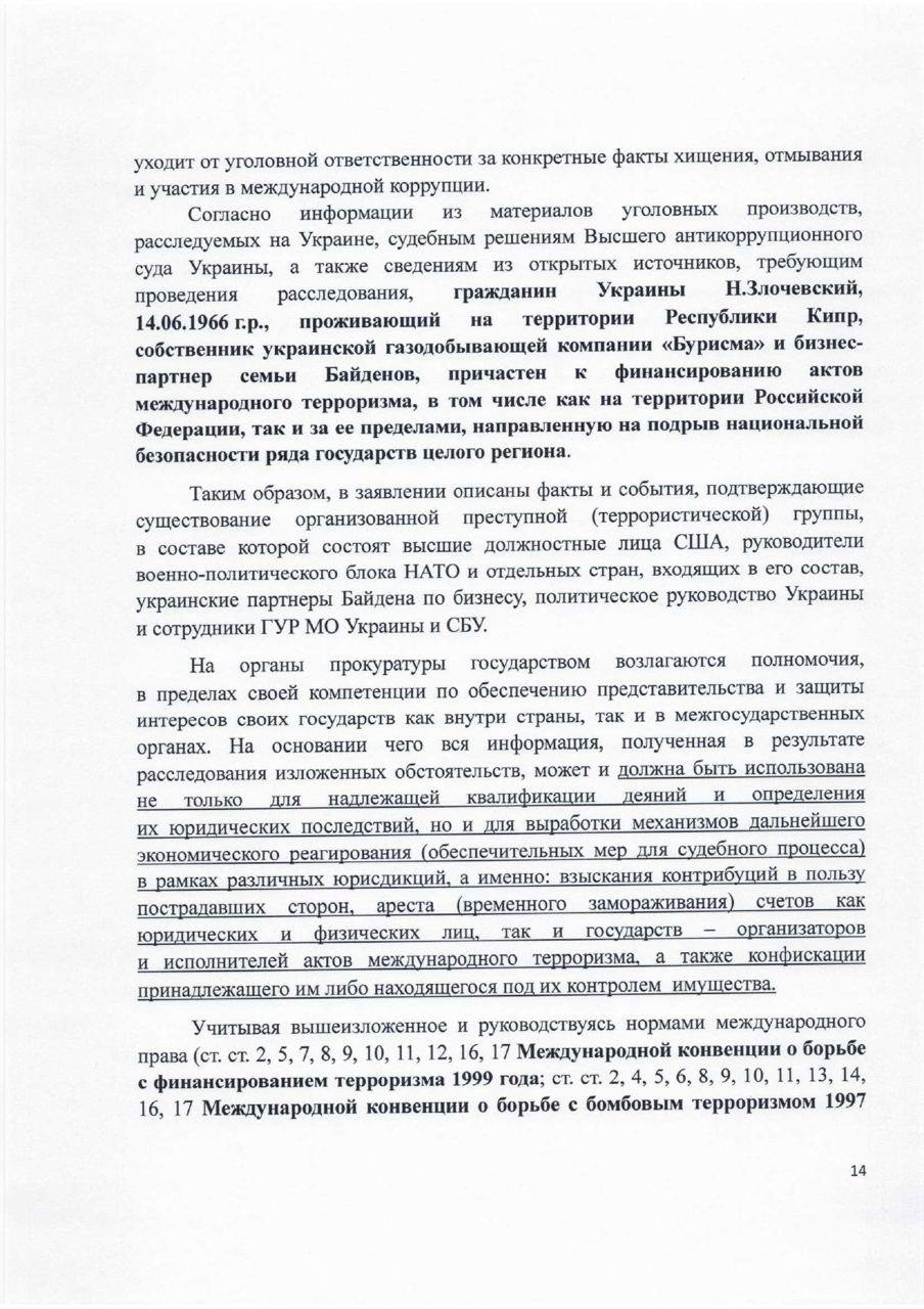 В заявлении говорится о "существовании организованной преступной (террористической) группы, в составе которой состоят высшие должностные лица США, руководители военно-политического блока НАТО и отдельных стран, входящих в его состав, украинские партнеры Байдена по бизнесу, политическое руководство Украины и сотрудники ГУР МО Украины и СБУ".