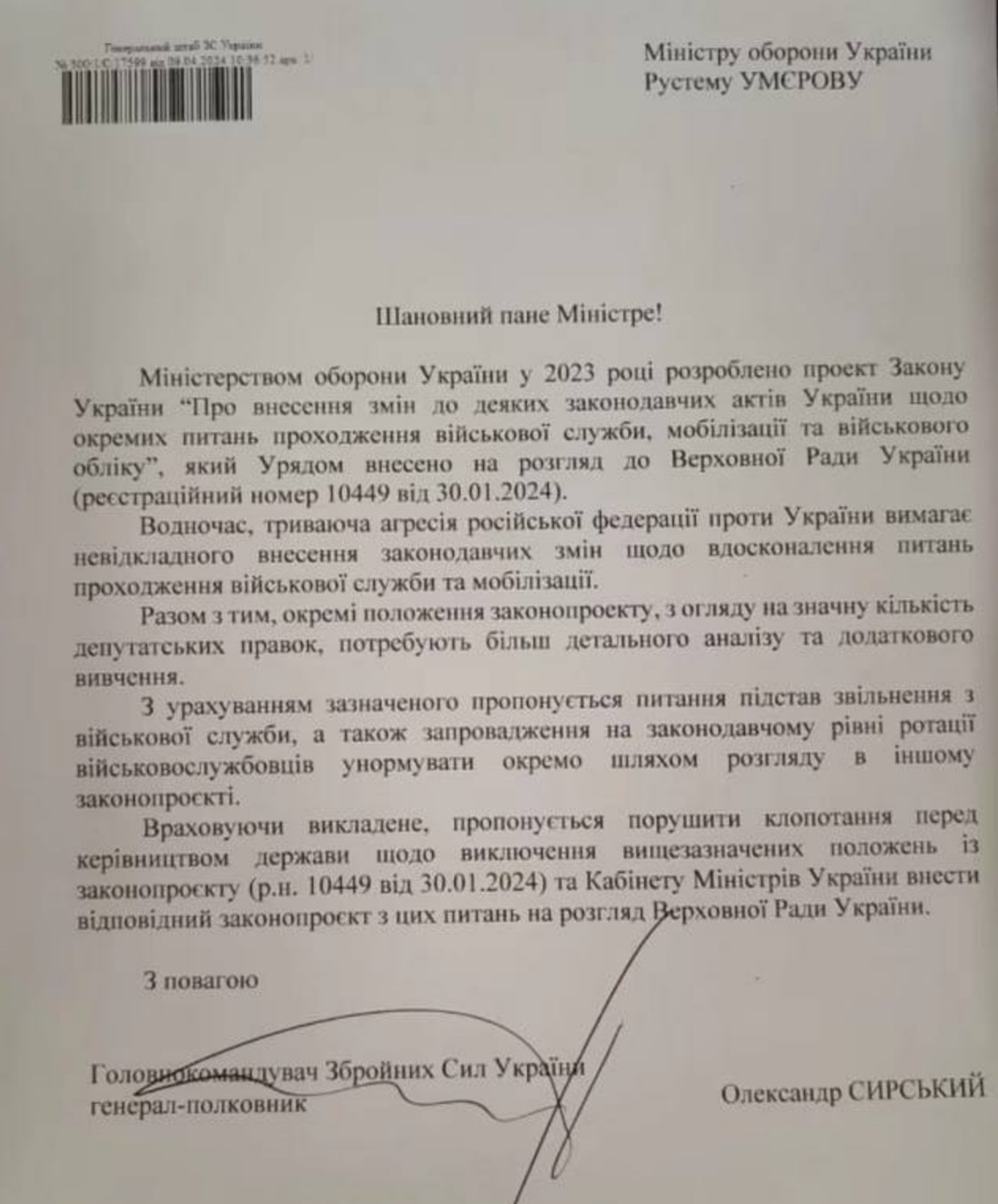 Вчера об этом сообщали СМИ и нардепы, ссылаясь на письмо главкома Сырского  министру обороны Умерову. Сырский предложил принять демобилизацию отдельным законом.