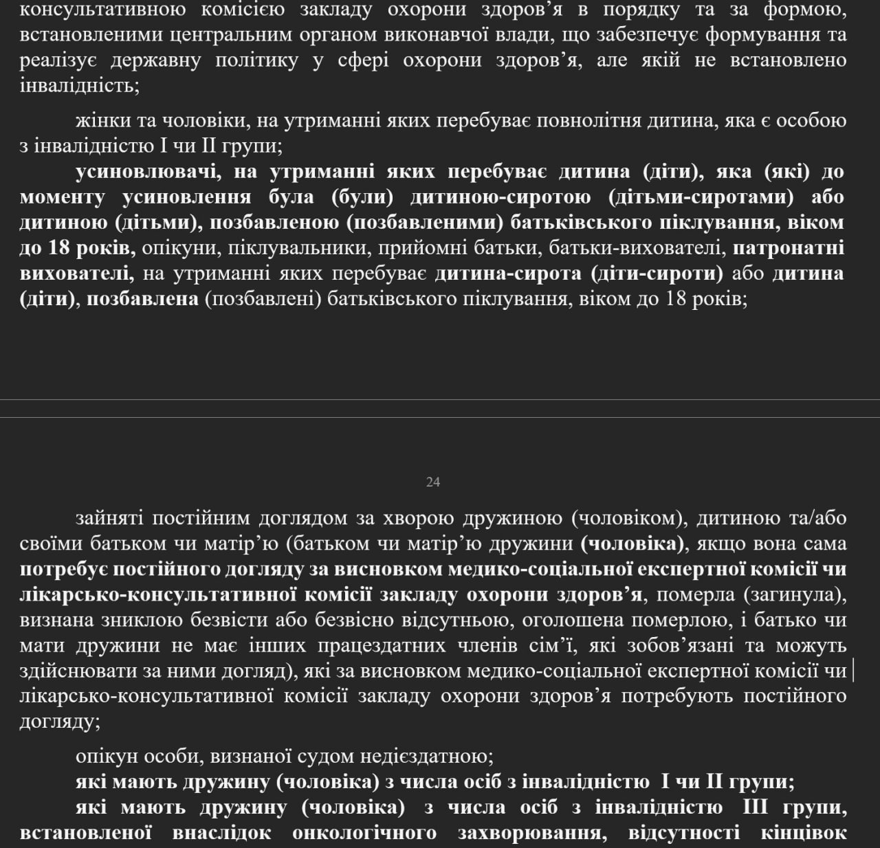 Проект усложнил правила отсрочки для тех, у кого на содержании родители-инвалиды 1-й и 2-й групп. Если из супругов-опекунов один невоеннообязанный, то второго могут мобилизовать. То есть если жена не идет служить, то в армию могут забрать мужа. Единственное исключение -  ситуации, когда супруга будет сама нуждаться в медицинском уходе (и это подтвердит медицинская комиссия).