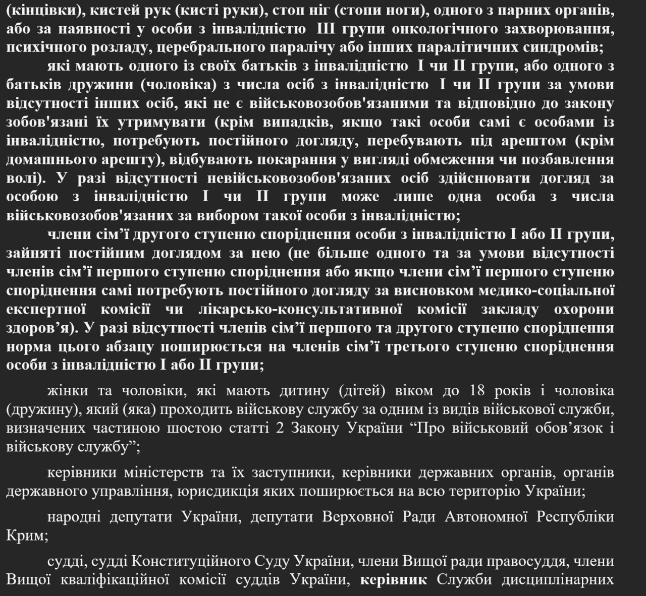 • Для супругов инвалидов третьей группы ввели ограничения. Они освобождаются от мобилизации лишь в случае инвалидности, установленной вследствие онкологического заболевания, отсутствия конечности, кисти, стопы, одного из парных органов, психического расстройства при онкологическом заболевании, церебрального паралича или других паралитических синдромов.